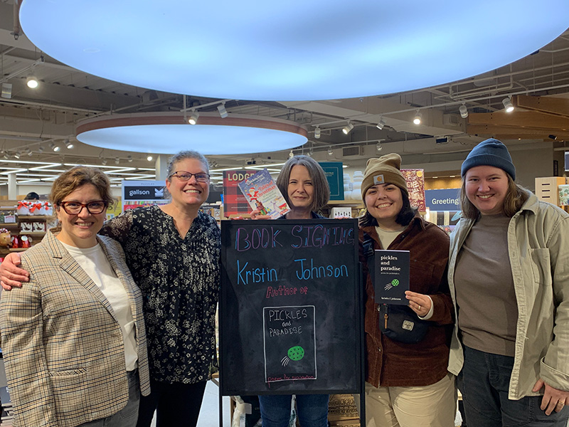 - Celebrating pickleball book at Barnes & Noble with friends and family: Alisa Duran, Christina Samion, Alex Samion, and Kristina Heggedal