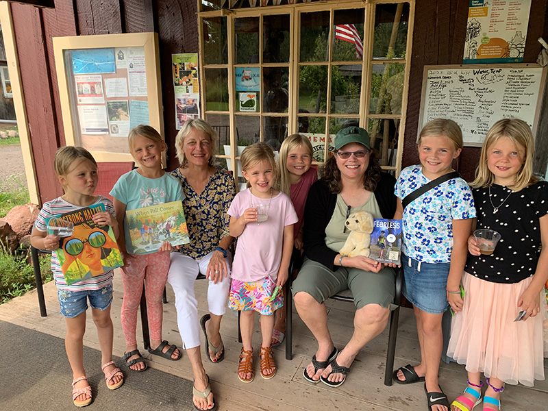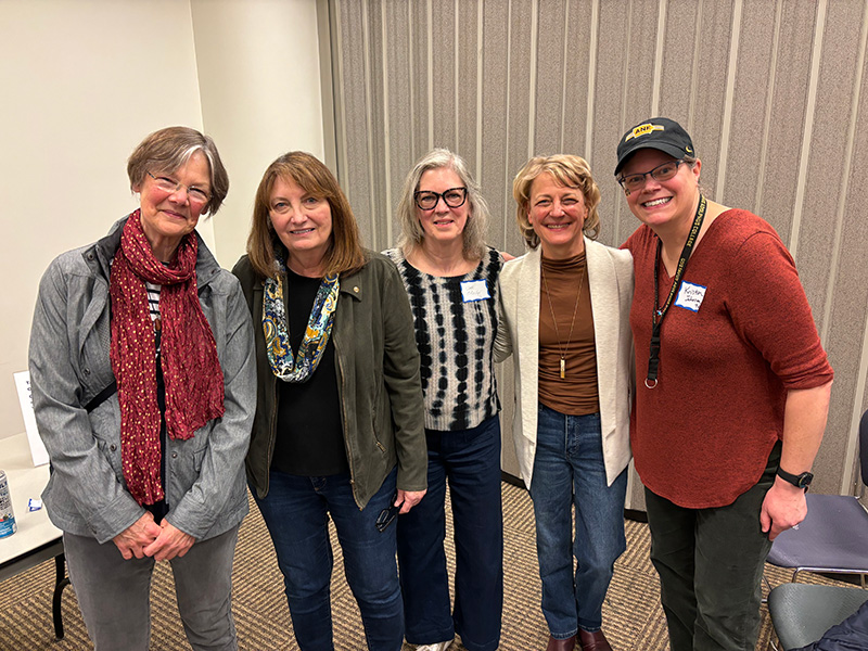 - Relaxing with writer friends after interviewing author Loretta: Joyce Sidman, Loretta Ellsworth, Jane O’Reilly, Aimée Bisonette, and me